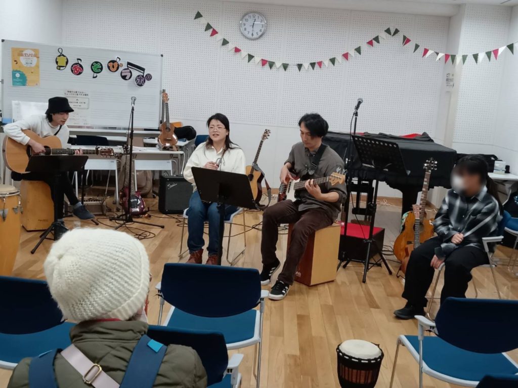 参加者さんのリクエストを中心に唱歌・童謡〜懐メロ〜流行りのJpopなど様々な曲や、自由に楽器に触って遊んだり